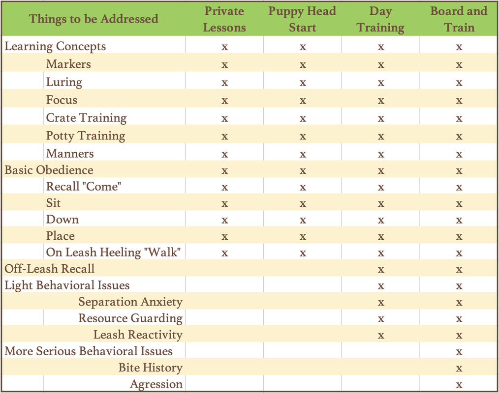 Not sure where to start? Use this chart to help you locate which program would be best suited for your pup!